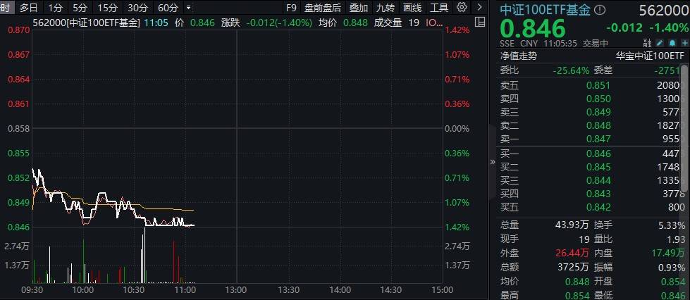 中证100ETF基金(562000)复制中证100指数走势,早盘低开后持续低位震荡,截至发文场内价格跌1.4%,成交额超3700万元。