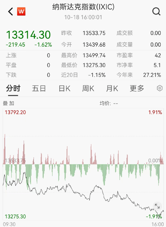 美东时间10月18日,美国三大股指全线收跌。截至收盘,道指跌0.98%,报33665.08点;标普500指数跌1.34%,报4314.6点;纳指跌1.62%,报13314.3点。沃尔格林联合博姿跌7%,卡特彼勒跌4.95%,领跌道指。万得美国TAMAMA科技指数跌1.73%,特斯拉跌4.78%,英伟达跌3.96%。
