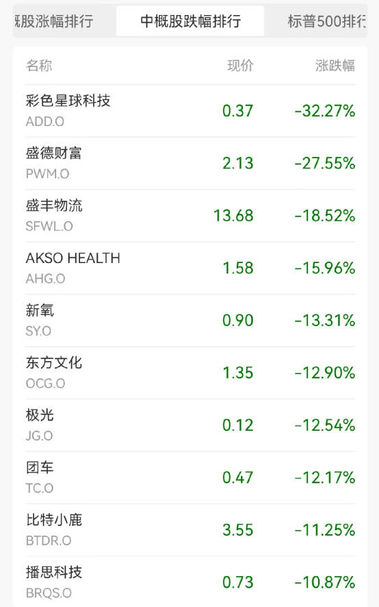 热门中概股普遍下跌,彩色星球科技跌32.27%,盛丰物流跌18.52%,领跌中概股。比特小鹿跌11.25%,嘉楠科技跌8.85%,小牛电动跌7.98%,比特数字跌7.48%,虎牙直播跌6.8%,大健云仓跌6.62%,能链智电跌6.07%,趣店跌5.94%,陆金所控股跌5.38%。中概新能源汽车股全线下跌,蔚来汽车跌7.21%,小鹏汽车跌10.34%,理想汽车跌1.95%。