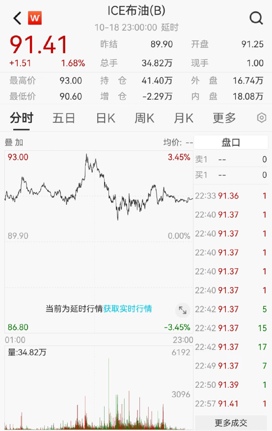 布油12月合约涨1.58%,报91.32美元/桶。油价盘中涨超3%至两周最高,升破93美元。