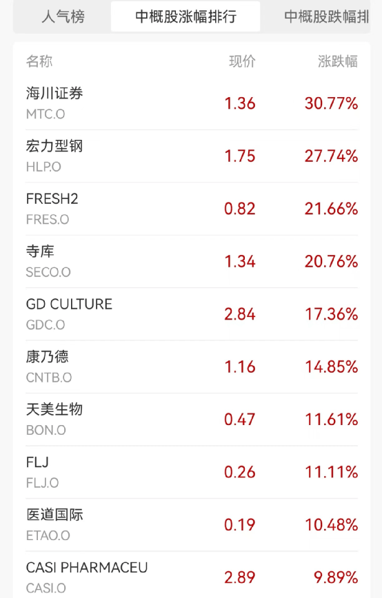 涨幅方面,海川证券涨30.77%,宏利型钢涨27.74%,领涨中概股。