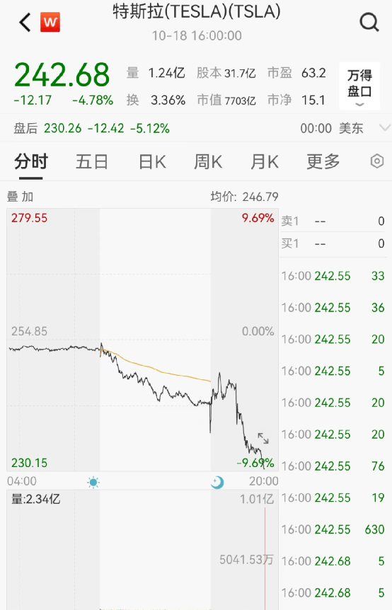 美东时间10月18日,由于利润大幅下滑,特斯拉股价暴跌。当日收于242.68美元,跌4.78%,一夜之间市值蒸发385.79亿美元,合人民币超2800亿美元!盘后交易继续大跌5.12%,加上收盘跌幅,合计暴跌近10%!