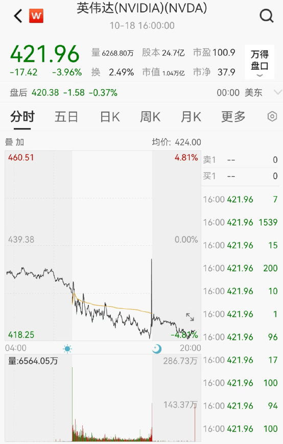 美东时间10月18日,英伟达股价大跌,收于421.96美元,跌3.96%。