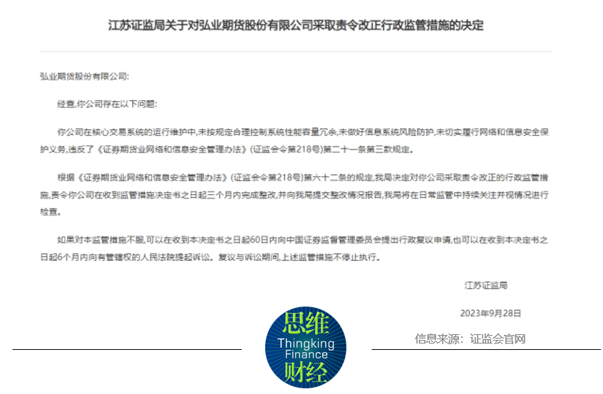 此外,证监会江苏监管局网站近日公布了《江苏证监局关于对弘业期货股份有限公司采取责令改正行政监管措施的决定》。
