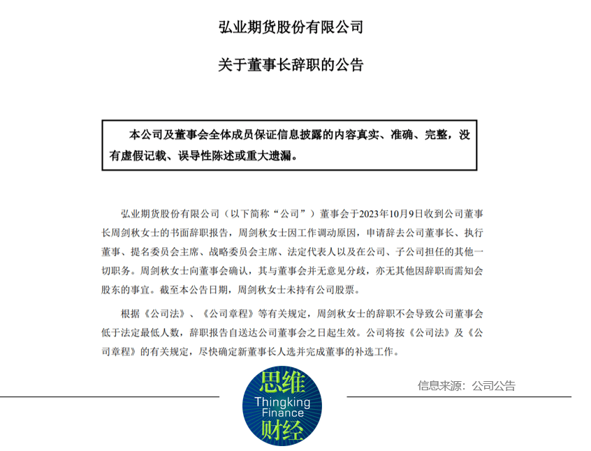 近日,弘业期货发布相关公告表示,董事会于2023年10月9日收到公司董事长周剑秋的书面辞职报告,周剑秋因工作调动原因,申请辞去公司董事长职务(见下图)。