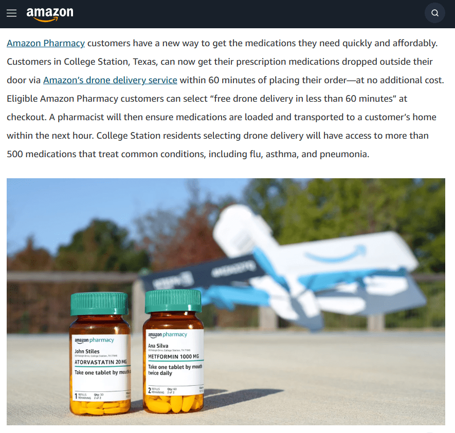 据介绍,位于当地的顾客可在下单 1 小时之内获得由亚马逊无人送货服务送到家的处方药。顾客可在结账环节选择“60 分钟内免费无人机送货”,随后药剂师将确保药品在接下来的 1 小时内将药品装好、并送到顾客家中。药物类型方面,当地居民可在 500 多种治疗流感、哮喘和肺炎等常见疾病药物之中选择。