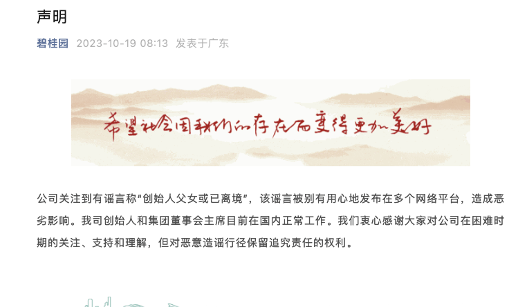 刚刚,碧桂园针对公司“创始人父女或已离境”的传言辟谣。