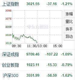 10月19日,A股主要指数震荡走弱,截至中午收盘,沪指跌1.21%报3021点,深证成指跌1.09%,创业板指跌0.79%。半日成交5007亿元。