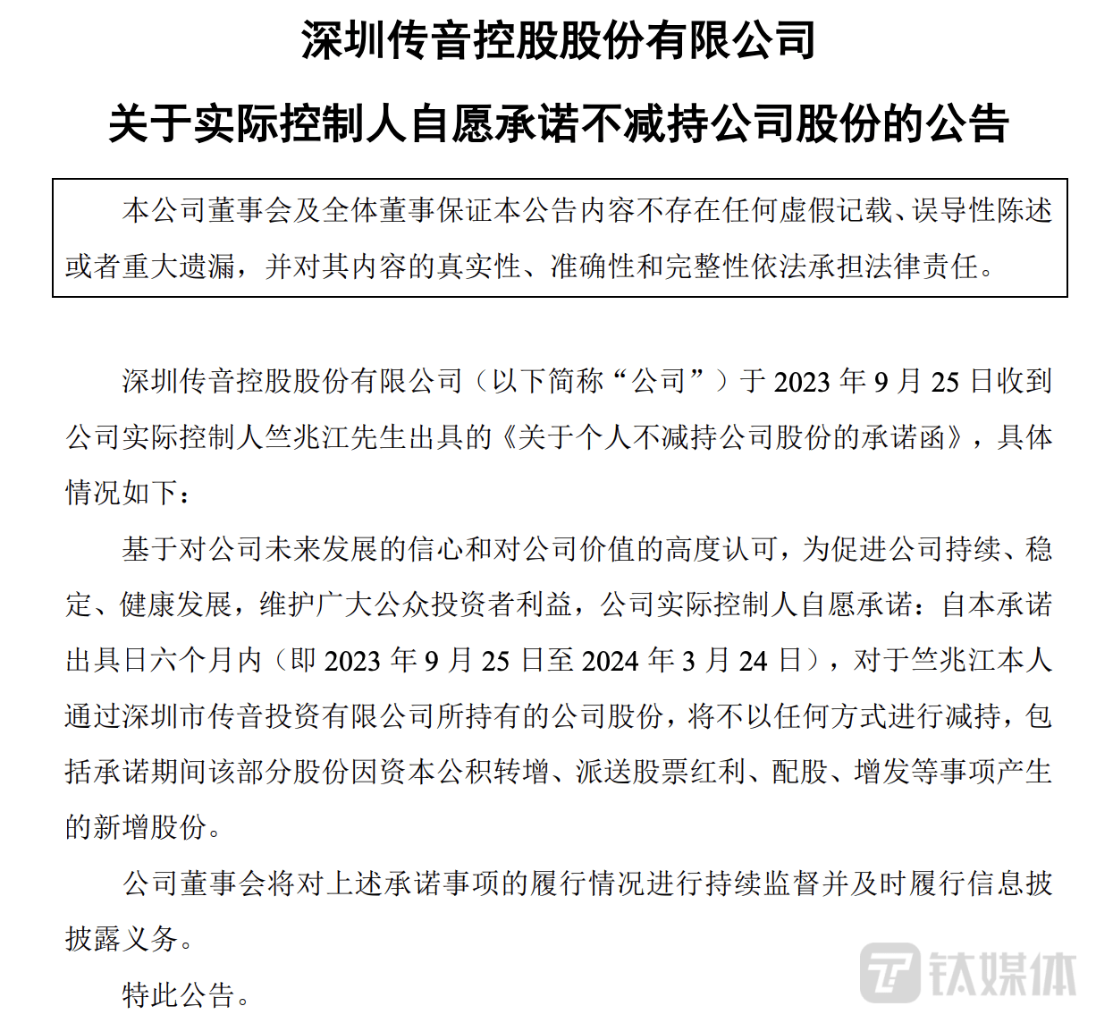 另外,传音此前还发布《关于实际控制人自愿承诺不减持公司股份的公告》称,公司实控人自愿承诺未来六个月内(即 2023 年 9 月 25 日至 2024 年 3 月 24 日),对于竺兆江本人通过深圳市传音投资有限公司所持有的公司股份,将不以任何方式进行减持,包括承诺期间该部分股份因资本公积转增、派送股票红利、配股、增发等事项产生的新增股份。华金证券认为,这份公告的发布一方面基于对于公司未来的持续看好,另一方面有助于增强市场买入信心。