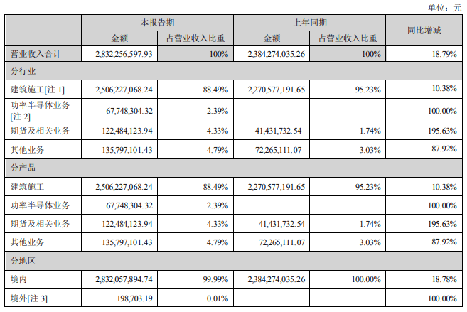 事实上,高新发展本质上还是一家建筑公司。根据2023年半年报,报告期,高新发展主营业务为建筑业和功率半导体业务。其中,建筑业是公司目前第一大收入及利润来源,功率半导体业务为公司战略转型确立的具备硬核技术的新主业。
