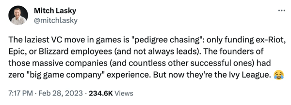 翻译:懒惰的VC在游戏行业只会“追逐血统”,只投前Riot、Epic或者暴雪员工创立的公司。这些大公司的创始人(还有其他数不清的成功公司)并没有“大型游戏公司工作经验”,可他们才是行业真正的佼佼者。
