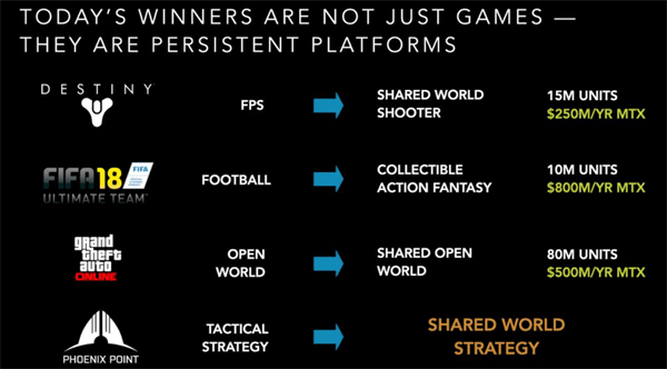 翻译:如今的赢家不仅是游戏,还是长期运营的平台。《命运》FPS—多人世界射击—每年2.5亿美元;《FIFA18》足球—集换式动作幻想—每年8亿美元;《GTA Online》—开放世界—多人开放世界—每年5亿美元;《Phoenix Point》战术策略—多人战术策略