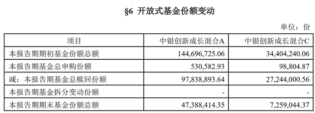 实际上,在二季度,中银创新成长混合就遭遇了投资者大量赎回。根据基金二季报显示,二季度初,中银创新成长混合A份额加C份额合计有1.79亿份,而二季度末,基金总份额剩余0.54亿份。