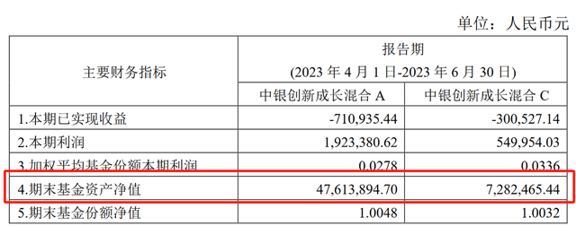 由此可见,2023年三季度,中银创新成长基金净值大幅下跌,基金的净利润可能出现亏损,进而使得基金净资产可能下跌,连续跌破5000万元。