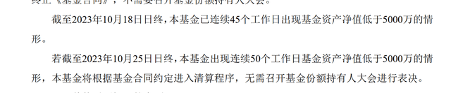 10月19日,中银基金旗下产品中银创新成长混合发布了第三次基金可能触发合同终止情形的公告。根据公告内容,截至2023年10月18日日终,中银创新成长混合已经连续45个工作日基金净资产低于5000万元,若截至2023年10月25日日终,该基金出现连续50个工作日,基金净资产低于5000万元,基金将终止运作。