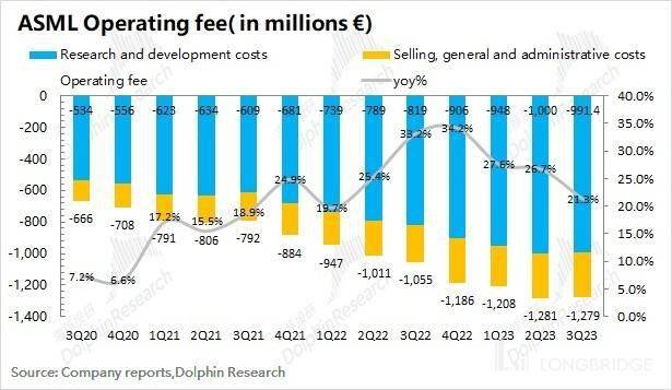 1.3 经营费用端:阿斯麦(ASML)在 2023 年第三季度经营费用为 12.79 亿欧元,同比增长 21.3%。