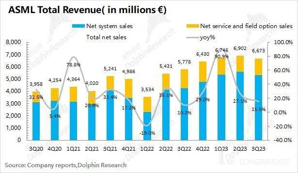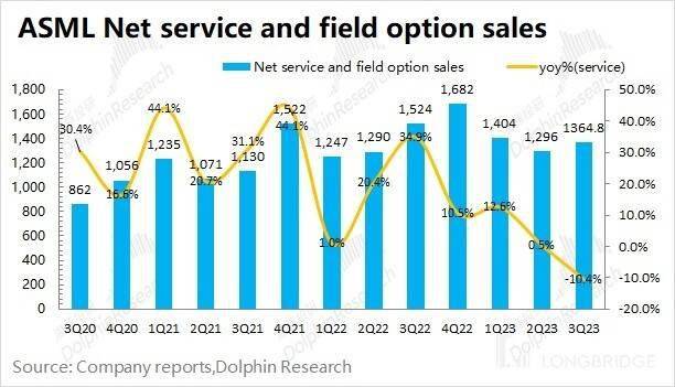 阿斯麦(ASML)的服务收入在 2023 年第三季度实现 13.65 亿欧元,同比下滑 10.4%。的服务收入,主要包括设备维护等项目,业务收入保持相对平稳。