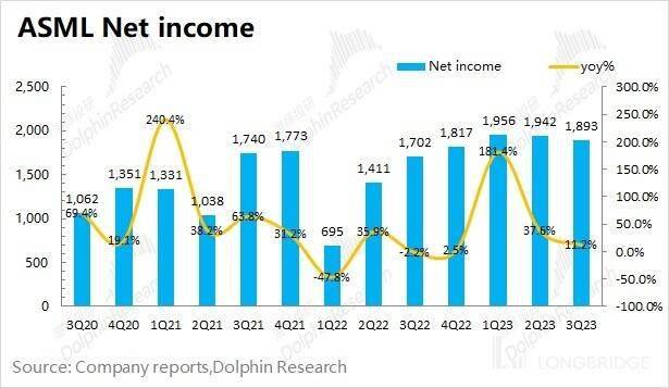 1.4 净利润端:阿斯麦(ASML)在 2023 年第三季度净利润为 18.93 亿欧元,同比增长 11.2%,略超市场预期(18.25 亿欧元)。本季度公司业绩增长主要来自于中国大陆客户拉货大幅提升的带来。