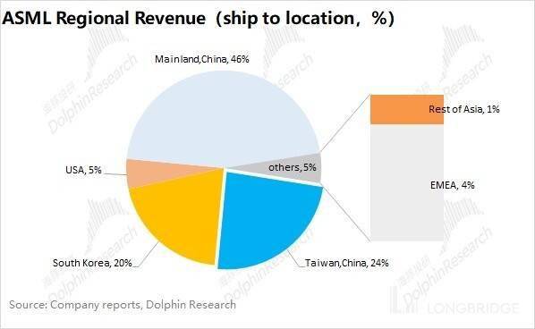但在细看公司财报后,海豚君认为阿斯麦业绩并没有数据上体现的那么稳定。本季度公司业绩能支撑住的最大一环是,中国大陆的大幅拉货。此前中国大陆的销售占比大多时候基本都维持在 25% 以下。本季度则暴增至 46%,主要来自于中国大陆产能扩充带来的拉货需求。