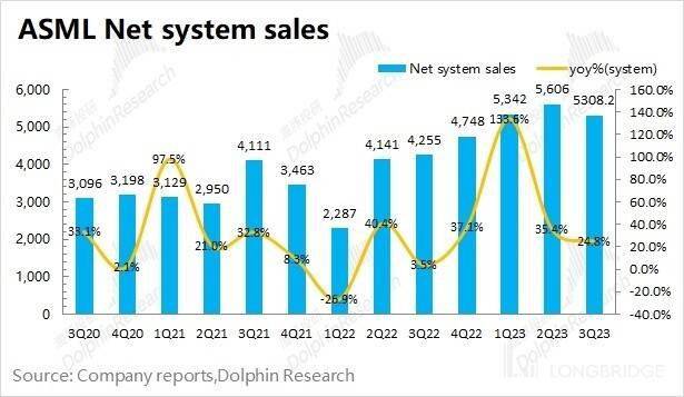 阿斯麦(ASML)的系统销售收入在 2023 年第三季度实现 53.08 亿欧元,同比增长 24.8%。系统销售业务的增长主要来自于 ArFi 和 ArF Dry 的大增,两项业务都有超过 50% 的增长幅度。随着中国大陆客户的拉货增加,ArFi 在系统销售业务中占比已经接近 50%,出货均价也提升至 0.8 亿欧元左右。