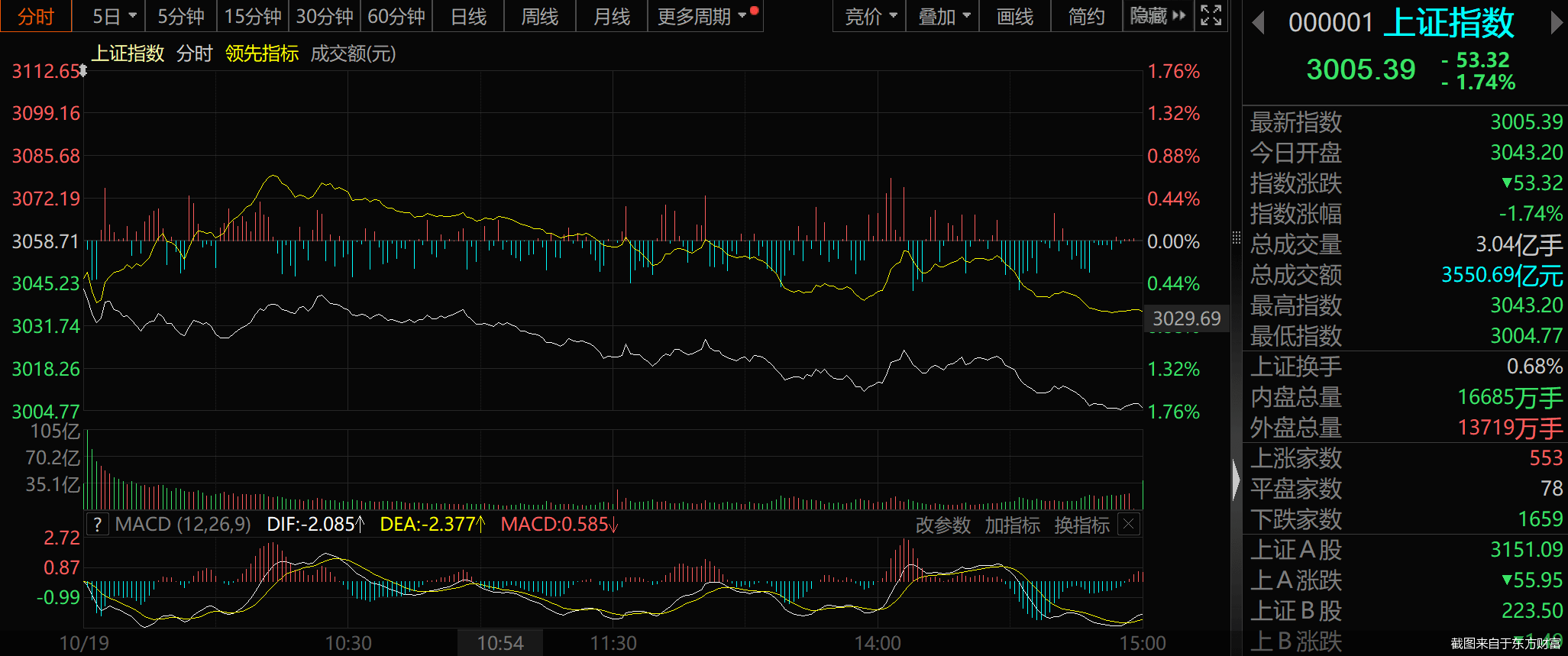 北京商报讯(记者 丁宁)10月19日,A股三大股指集体收跌,均创年内新低;其中沪指收跌1.74%,报3005.39点,险守3000点;深证成指收跌1.65%;创业板指收跌1.28%。