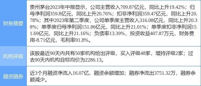 2023年8月7日,申港证券研究员曹旭特,张弛发布了对贵州茅台的研报《半年报点评:茅台稳如磐石 直销驱动高增》,该研报对贵州茅台给出“买入”评级,认为其目标价为2141.0元,研报发布时股价为1769.00元,预期涨幅为21.03%。研报中预计公司2023-2025年的营收分别为1517.7亿元、1779.1亿元和2066.7亿元,对应同比增长19%、17.2%、16.2%,归母净利润分别为747.4亿元、880.2亿元和1025.3亿元,对应同比增长19.2%、17.8%、16.5%,EPS分别为59.49元、70.07元和81.62元,对应报告日股价的PE分别为31.6倍、26.8倍和23倍。参考高端白酒估值水平,考虑到公司较强的经营稳定性和业绩确定性,对应公司23年预测净利润给予36倍PE,对应目标价格2141元,维持对公司的“买入”评级。证券之星数据中心根据近三年发布的研报数据计算,该研报作者对此股的盈利预测准确度为78.24%。