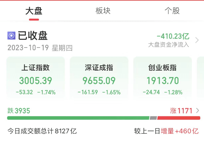 红星资本局10月19日消息,A股三大指数今日延续弱势表现,齐创年内新低。截至收盘,沪指跌1.74%,险守3000点,收报3005.39点;深证成指跌1.65%,收报9655.09点;创业板指跌1.28%,收报1913.70点。