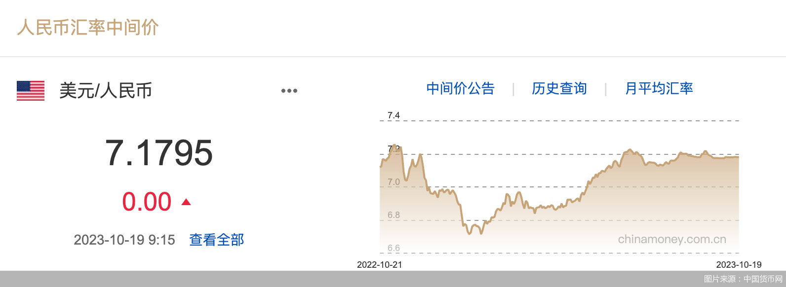北京商报讯(记者 廖蒙)10月19日,人民银行授权中国外汇交易中心公布,2023年10月19日银行间外汇市场人民币汇率中间价为:1美元对人民币7.1795元,前一交易日中间价报7.1795元,单日保持“按兵不动”,震荡幅度为0基点。