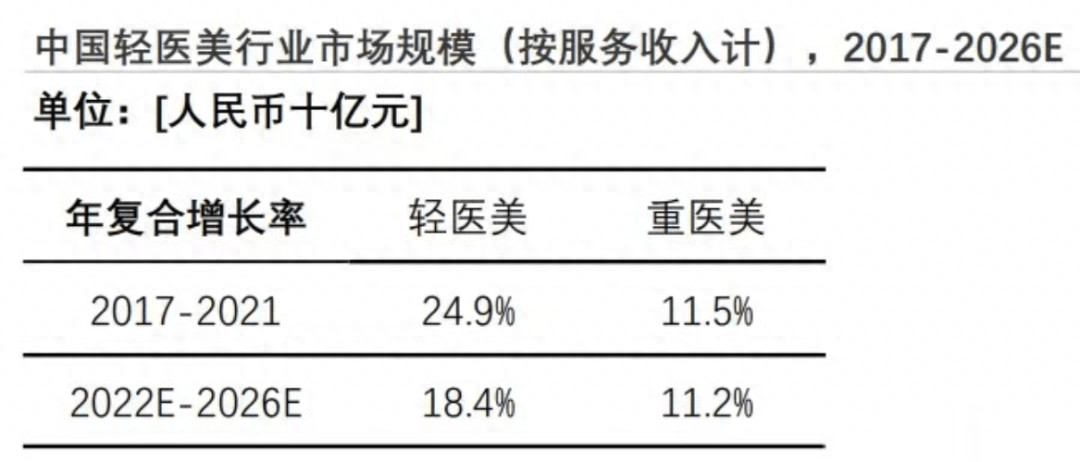 近几年,社会老龄化加剧,人们的抗衰老需求也明显提升,医美市场规模增速很快。在医美市场中,轻医美因为风险低、恢复快,受众更广,市场增速也更快。头豹研究院 2023 年发布的中国轻医美行业报告显示,2017-2021 年的轻医美市场年复合增长率为 24.9%。