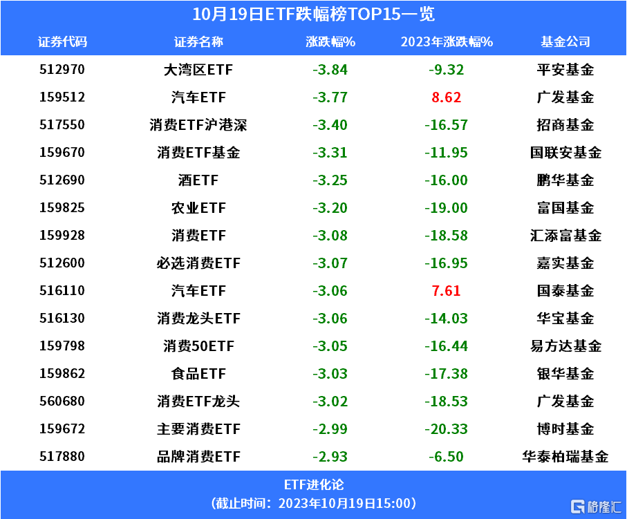 ETF方面,汽车股跌幅居前,汽车ETF跌3.77%,消费股全天萎靡,消费ETF沪港深、酒ETF分别跌3.4%、3.25%。农业板块走低,农业ETF跌3.2%。