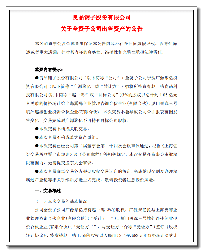 10月16日晚,良品铺子发布公告,公司全资子公司广源聚亿将以1.05亿元的价格,转让所持赵一鸣零食3%的股权。转让完成后,广源聚亿不再持有赵一鸣零食的股权。