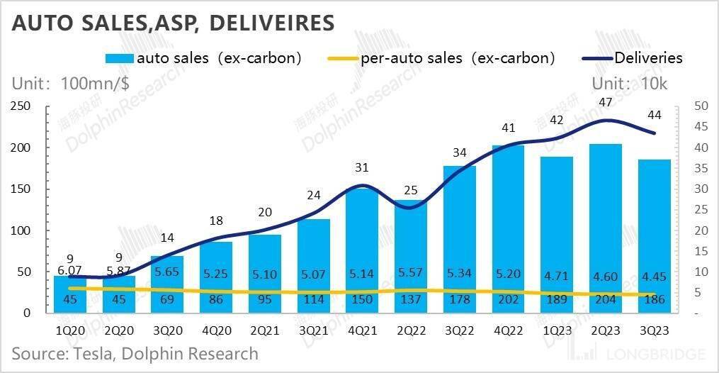 2.3)单价下滑不严重,汽车收入还可以:三季度整体实现汽车销售及及其积分收入合计 196 亿美元,同比增 46%,低于市场预期的 203 亿美金,主要是因为单价表现较差。其中,汽车租赁业务收入 4.9 亿美元,也低于上季度的收入。