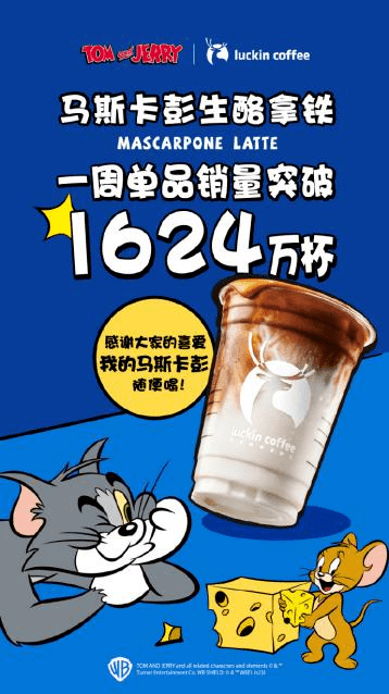 10月16日,瑞幸联名猫和老鼠,马斯卡彭生酪拿铁首周销量突破1624万杯,该数据已超此前全部新品的首周最高记录。