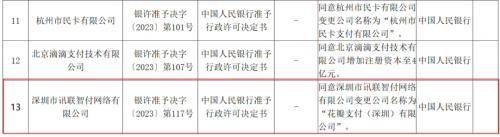 比如几天前,中国人民银行更新了非银行支付机构重大事项变更许可信息,同意深圳市讯联智付网络有限公司变更公司名称为“花瓣支付(深圳)有限公司”。