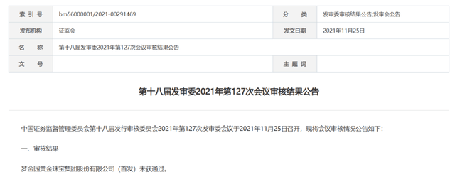 2021年10月28日,证监会发审委2021年第116次会议暂缓表决梦金园的首发申请。不到一个月后,2021年第127次发审委会议否决了梦金园的上市申请。