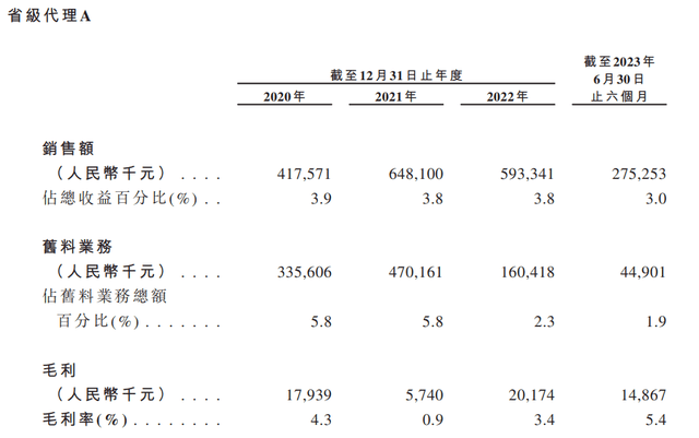 2020年至2023年上半年(以下称为:三年一期),梦金园特许经营网络的销售占比除了在2021年有所降低外,呈现了逐步攀升的趋势。2023年上半年,加盟商和省代的销售占比甚至高达95.1%。