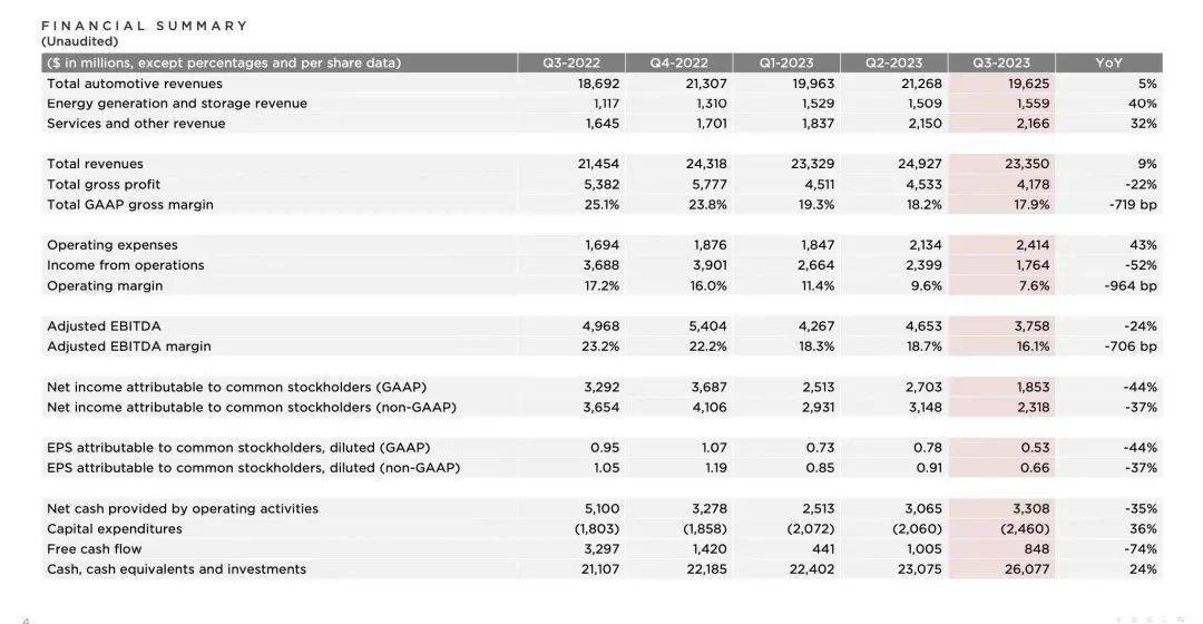 第三季度,特斯拉各项业绩指标均明显下滑。