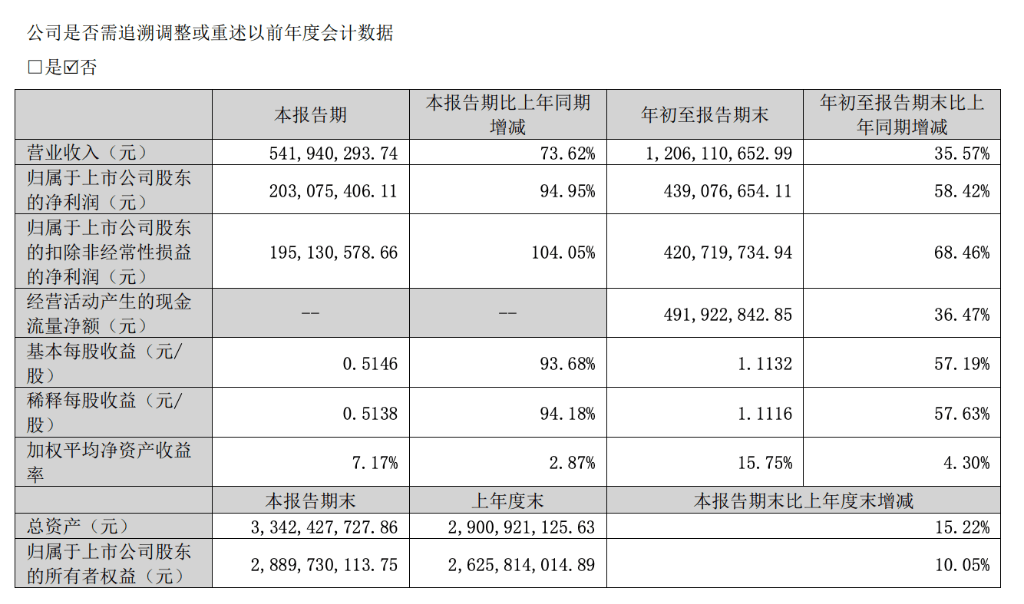 受益于全球数据中心建设对光器件产品需求的稳定增长,天孚通信第三季度实现营收5.4亿元,同比增长73.6%,实现归母净利润2.03亿元,同比增长94.95%。