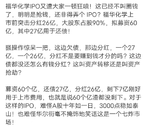 起因是福华化学在提交发行上市申请前,明明有钱,却先进行了大额分红,继而又要来资本市场借钱还债,因此,投资者对于福华化学“谜之操作”的目的性产生了怀疑。