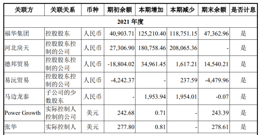 例如,2021年底,控股股东福华集团往来余额为4.74亿元;控股股东控制公司德邦贸易与福华化学的资金往来余额为1.45亿元等。