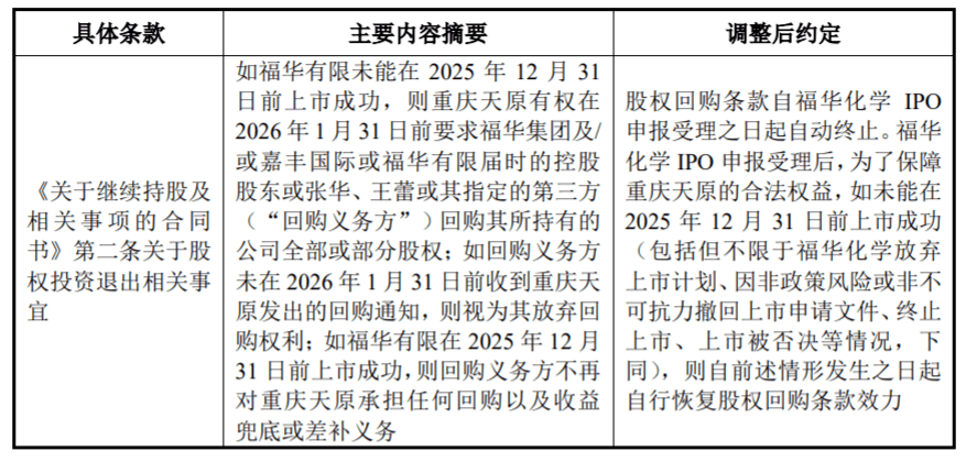 比如,如果福华化学未能在2025年12月31日前上市成功(包括但不限于福华化学放弃上市计划、因非政策风险或非不可抗力撤回上市申请文件、终止上市、上市被否决等情况,下同),则福华化学第六大股东重庆天原有权在2026年1月31日前要求福华集团及/或嘉丰国际或福华有限届时的控股股东或张华、王蕾或其指定的第三方(“回购义务方”)回购其所持有的公司全部或部分股权。如果上市,则相关条款失效。