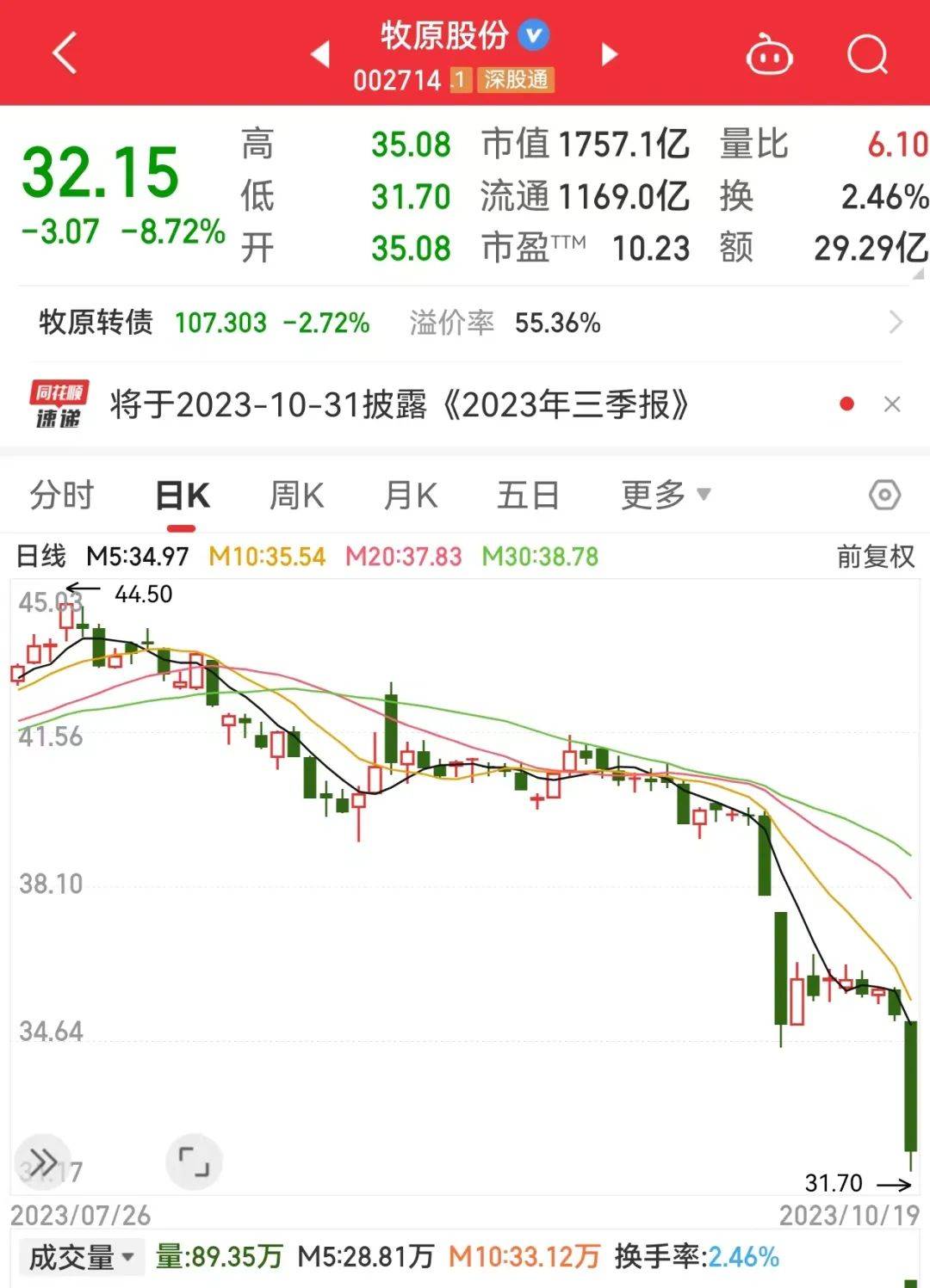 跌幅最大的是牧原股份,该公司为猪肉养殖龙头,今日盘中触及跌停板,收盘跌幅8.72%,最新A股市值跌破1800亿元。今年上半年,该公司净利润亏损27.79亿元。公司发布的9月份生猪销售简报显示,2023年9月份,公司销售生猪537.3万头,销售收入98.7亿元。2023年9月份,公司商品猪价格相比2023年8月份有所下降,商品猪销售均价15.82元/公斤,比2023年8月份下降3.24%。