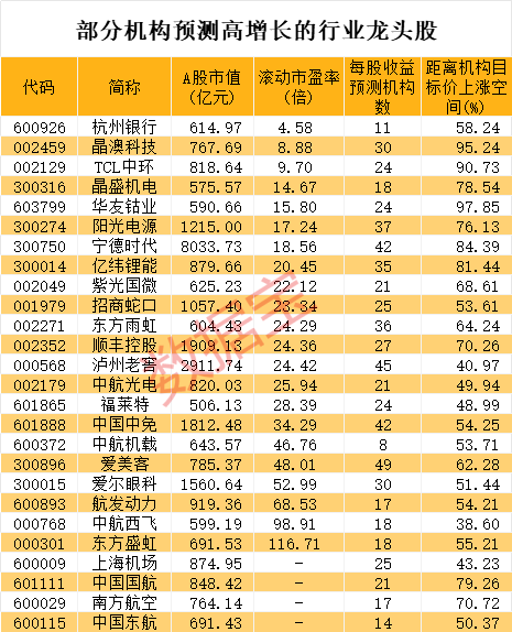 从未来增长潜力来看,根据5家以上机构一致预测,26只股票今明两年净利润增速均有望超20%。以最新收盘价与机构一致目标价相比,这些股票上涨空间均介于30%至100%之间。上涨空间最高的是华友钴业,达到97.85%;上涨空间较大的还有晶澳科技、TCL中环、宁德时代、亿纬锂能、中国国航等。