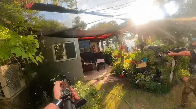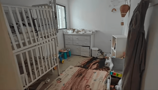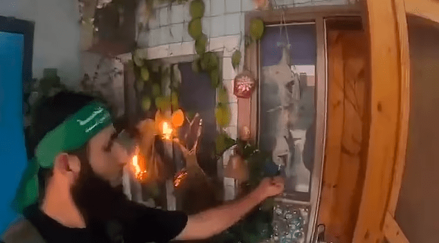 哈马斯武装分子用打火机点燃室内植物和悬挂的装饰品