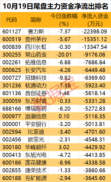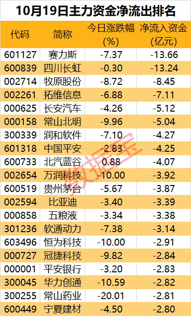 华为产业链两大热门股赛力斯、四川长虹遭到主力出逃超13亿元。拓维信息主力资金净流出超7亿元;常山北明跌停,主力资金净流出5.04亿元;润和软件主力资金净流出4.27亿元。