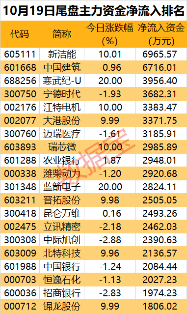 18股尾盘主力资金净流入金额超2000万元。新洁能、中国建筑尾盘主力资金净流入超6000万元,居前列。