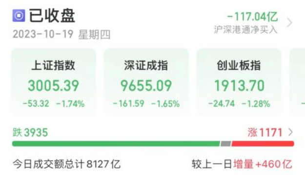 10月19日,沪指一举跌破前期低点3053点,收报3005.39点。深证成指下跌1.65%,创业板指下跌1.28%。三大指数均创下了年内新低。