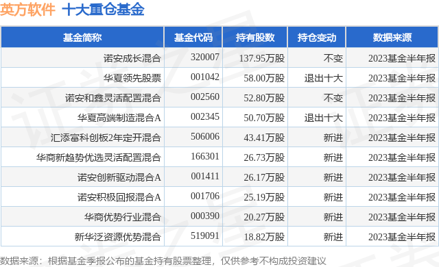 根据2023基金半年报公募基金重仓股数据,重仓该股的公募基金共213家,其中持有数量最多的公募基金为诺安成长混合。诺安成长混合目前规模为226.93亿元,最新净值1.265(10月17日),较上一交易日上涨0.64%,近一年下跌4.73%。该公募基金现任基金经理为刘慧影。刘慧影在任的基金产品包括:诺安优化配置混合A,管理时间为2022年8月3日至今,期间收益率为2.0%;诺安积极回报混合A,管理时间为2023年9月29日至今,期间收益率为-3.69%。