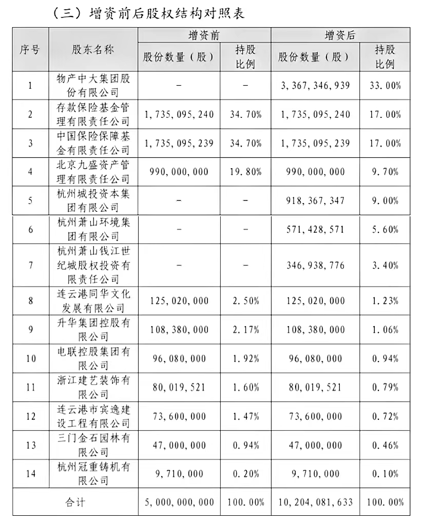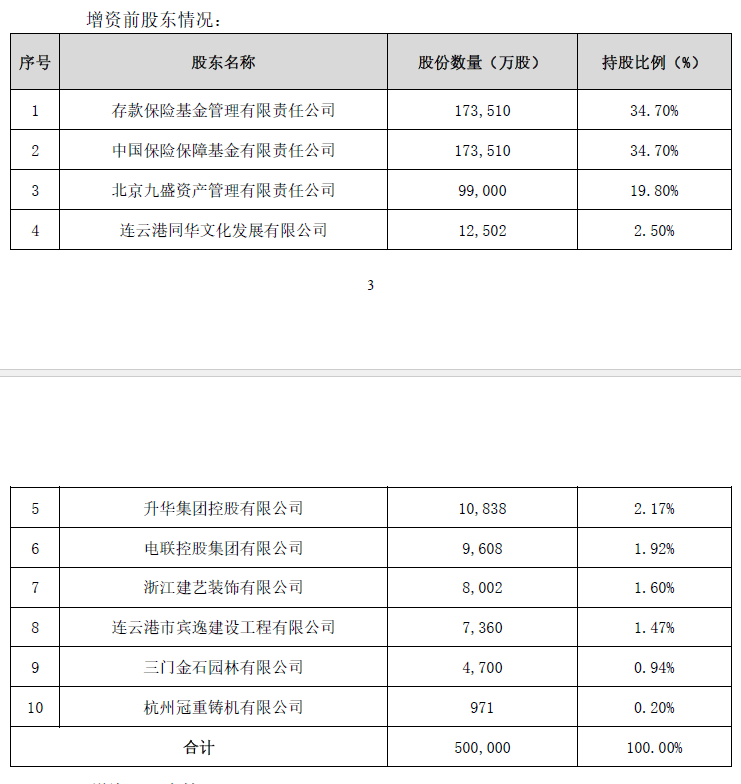 对照增资前的股权结构图可知,此前第一、二大股东存款保险基金、保险保障基金分别持股17.35亿股(保险保障基金少1股),比例分别为34.7%,而这二者股份数量加起来就达到34.7亿股,接近本次表决同意票数。9.9亿股反对,原股东结构中,第三大股东北京九盛资管公司刚好持股9.9亿股。另有持股比例7.03%的股东未出席此次会议,或为连云港同华文化、电联控股集团、连云港市宾逸建设、三门金石园林、杭州冠重铸机等5家小股东。据此,基本可以推断,此次增资方案由存款保险基金、保险保障基金主导,才最终得以明确。