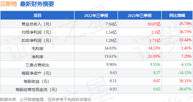 据证券之星公开数据整理,近期贝斯特(300580)发布2023年三季报。根据财报显示,本报告期中贝斯特营收净利润双双增长。截至本报告期末,公司营业总收入10.07亿元,同比上升26.74%,归母净利润2.1亿元,同比上升36.73%。按单季度数据看,第三季度营业总收入3.73亿元,同比上升22.45%,第三季度归母净利润8030.55万元,同比上升9.16%。